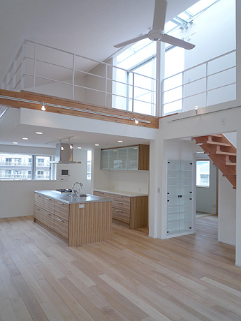 スモークガラスを組込んだ吊戸棚にカウンターと大きな引出。